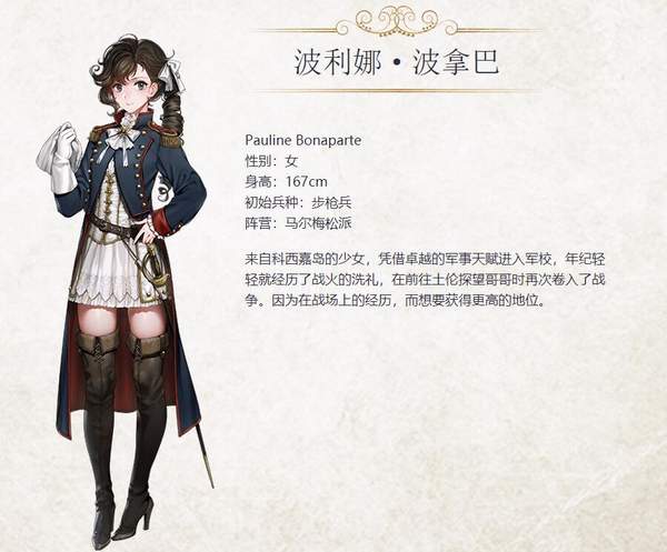目前《圣女战旗》官网上展示了7名游戏登场角色,包括女主角——拿破仑的妹妹波利娜·波拿巴以及未来的法兰西第一帝国皇后约瑟芬等人,具体信息如下图: